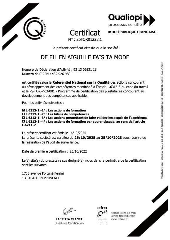 L’association De Fil En Aiguille Fais ta Mode vous propose des formations professionnalisantes (mais attention pas diplômantes), dans le secteur de l’habillement. Nous pouvons vous initier au sur-mesure, au prêt-à-porter, à la retouche…